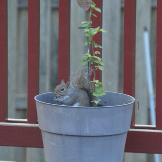 Mijn laatste alinea van vandaag besteed ik aan het eigenlijke onderwerp van deze blog: eekhoorns. Als Belg ben ik vertederd door deze pluisstaarten. Hier worden ze eerder beschouwd als een pest. Ze zitten overal, zijn nergens bang voor en passen zich moeiteloos aan aan elke omgeving. Objectief gezien zijn ze een even grote plaag als de ratten in't Stad, maar ze hebben een mooie staart in plaats van zo'n griezelig, kaal ding en daarom vind ik ze fantastisch. T gaat nog een stapje verder in zijn bewondering. Die heeft onze tuin omgetoverd in een vogel- en eekhoornparadijs. Om de paar dagen worden alle bakjes en voederplankjes bijgevuld. De eerste weken was er niet veel activiteit, maar Chez T is intussen een succesvol concept. Minstens zeven soorten vogels komen elke dag meermaals eten. En de eekhoorns? Die zijn bezig met het vormen van een guerrilla ... Ze worden roekelozer met de dag: graven in mijn bloempotten, bespringen de vogelvoederstanden en bestormen het terras. Het zou me niet verbazen als er binnenkort een paar aan het zwembad liggen met een cocktail in de poot. Maar het is mooi krapuul, dus ik laat hen gedijen. Ook T mag losgehen en zwaar overdrijven in al die verwennerij. Hij is safe. Voorlopig. Hoe mijn op uiterlijk gefixeerde ik zal reageren als ooit zijn sixpack verdwijnt en zijn staart niet meer spontaan verschijnt? Dat is een andere vraag ...